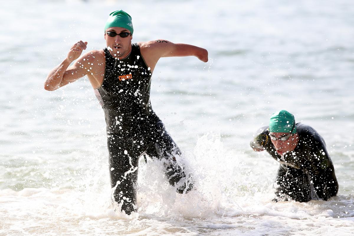 Martin Schulz of Germany emerges from the water in the swim portion of the men's PT4 class during the Aquece Rio Paratriathlon at Copacabana beach.