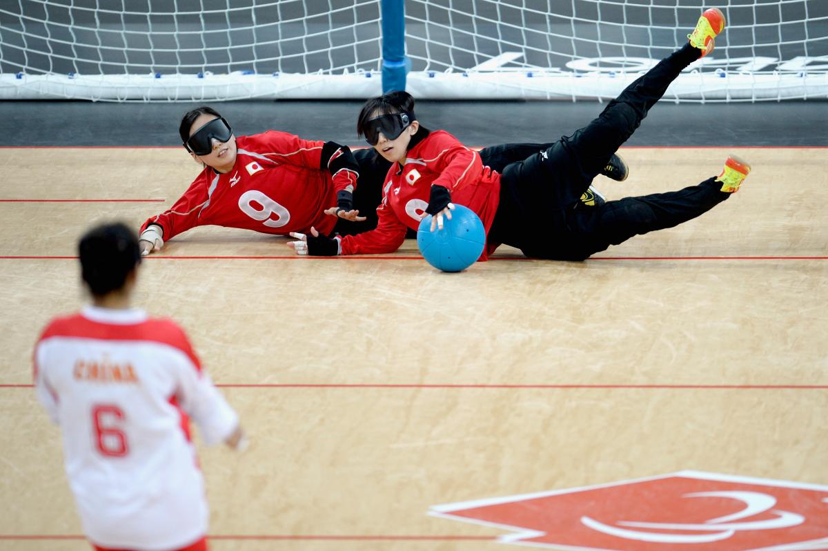 Rie Urata of Japan and Akiko Adachi (L) block the ball during their Women's Team Goalball Gold Medal match against China on day 9 of the London 2012 Paralympic Games