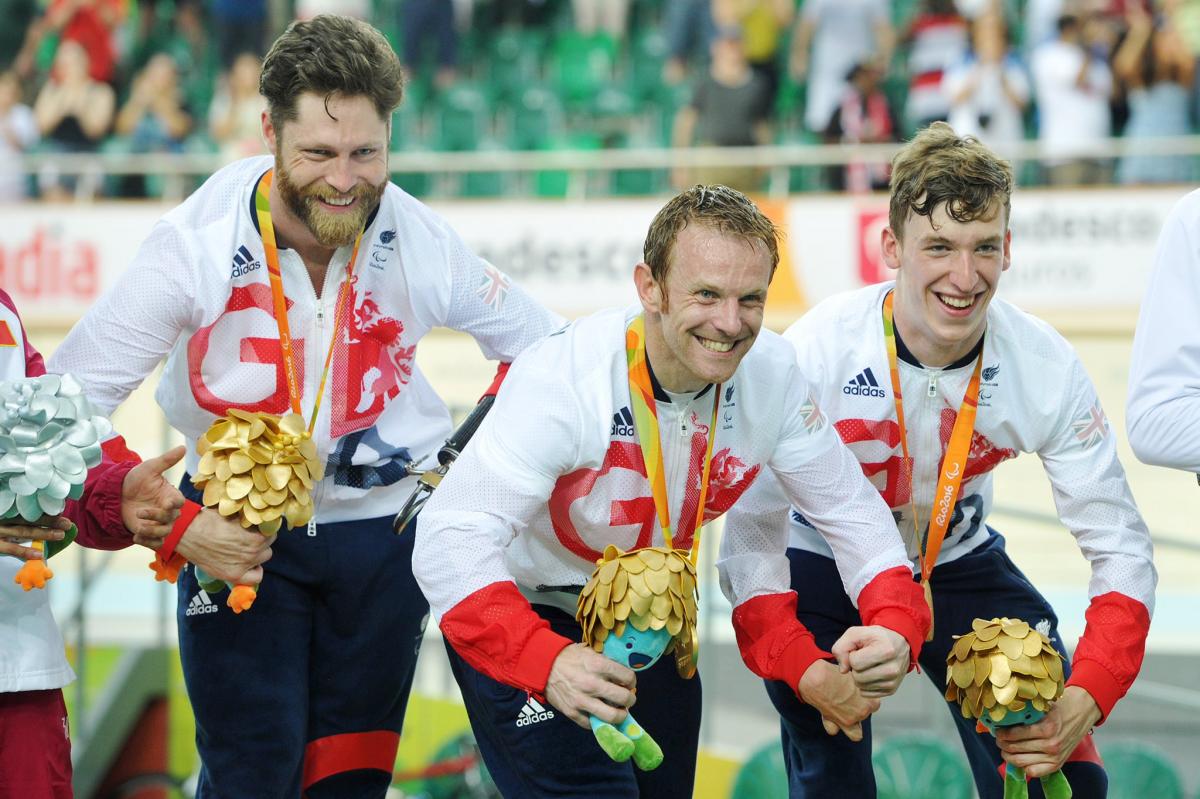 Louis Rolfe, Jon-Allan Butterworth and Jody Cundy celebrate gold medal for team GB