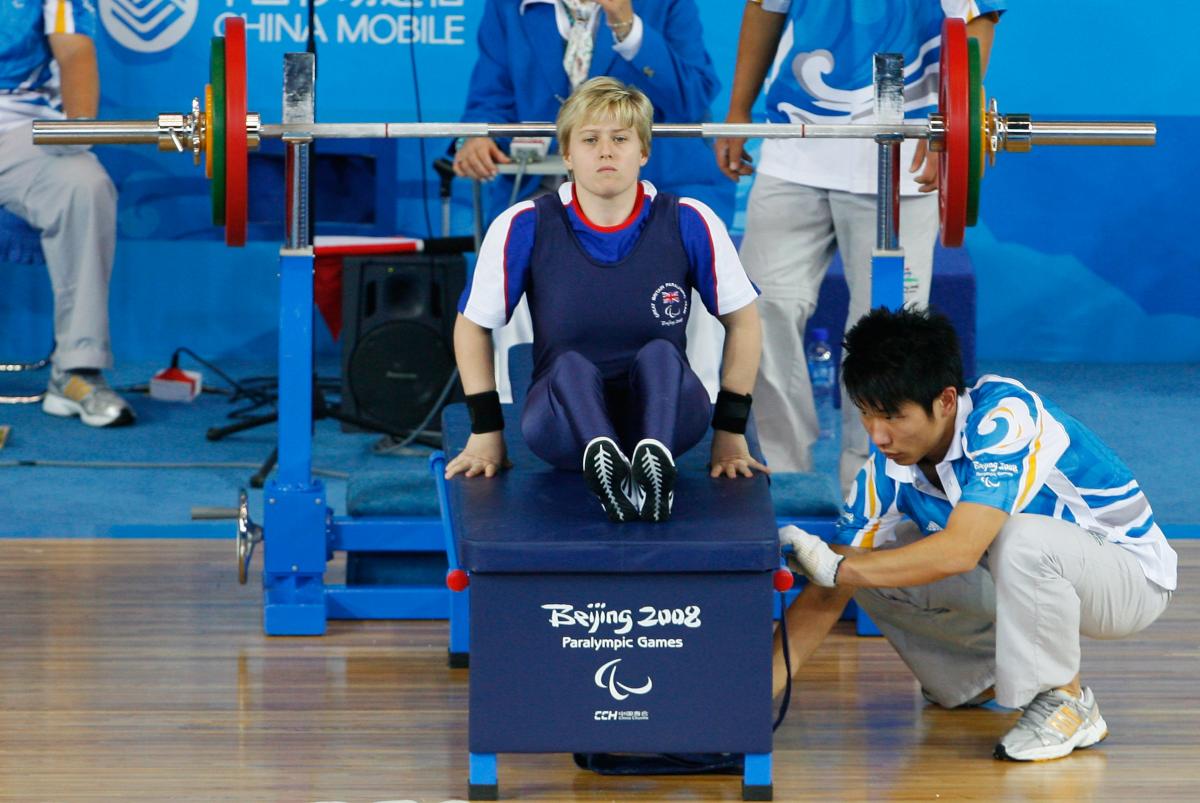 Natalie Blake of Great Britain prepares hereself for a lift in the women's 48kg group A powerlifting competition at the Beijing University of Aeronautics & Astronautics Gymnasium during day four of the 2008 Paralympic Games on September 10, 2008 in Beijing, China.