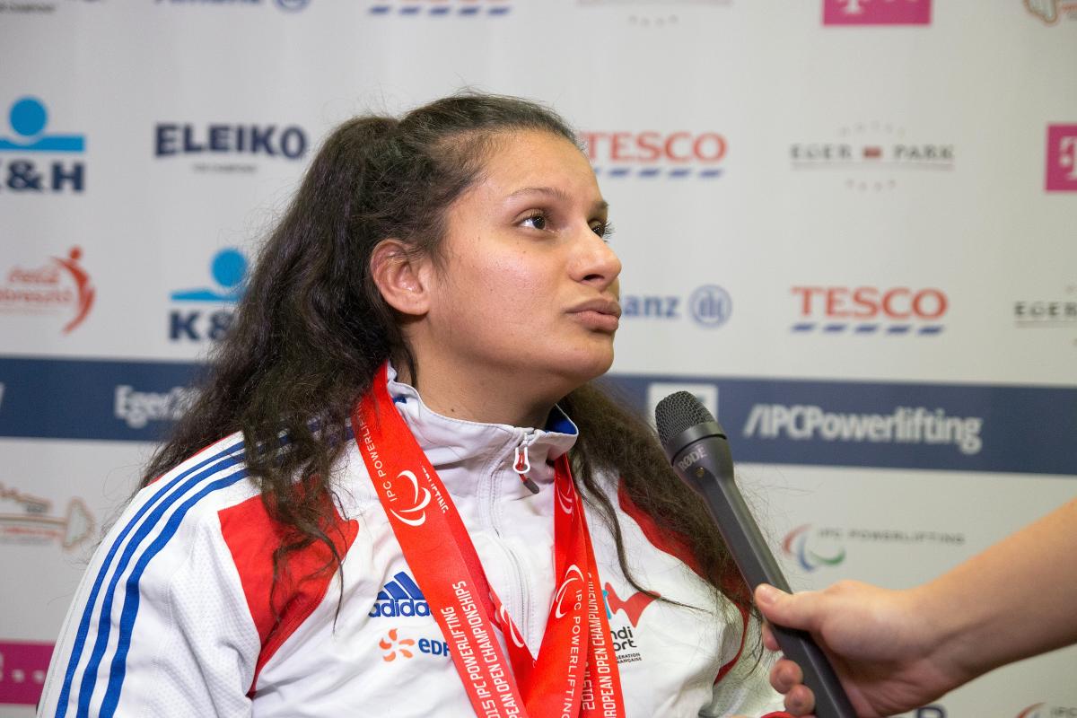Souhad GHAZOUANI, France, being interviewed in the mixed zone at the 2015 IPC Powerlifting European Open Championships in Eger, Hungary