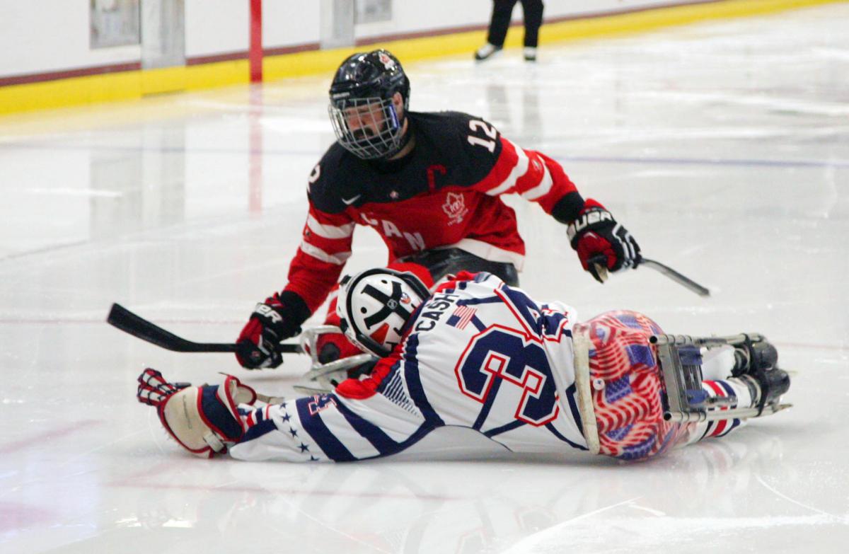 Steve Cash making a save against Greg Westlake in the gold medal game USA v Canada at the 2015 IPC Ice Sledge Hockey World Championships A-Pool in Buffalo, USA.