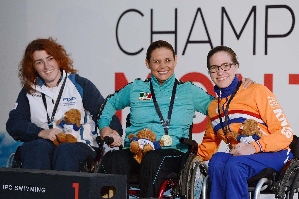 Medal Winners for the women's 50m freestyle S4, Arjola Trimi of Italy (silver), Nely Miranda Herrera of Mexico (gold) and Lisette Teunissen of the Netherlands (bronze) pose with their medals during IPC Swimming World Championships at Parc Jean Drapeau on August 12, 2013 in Montreal, Canada.