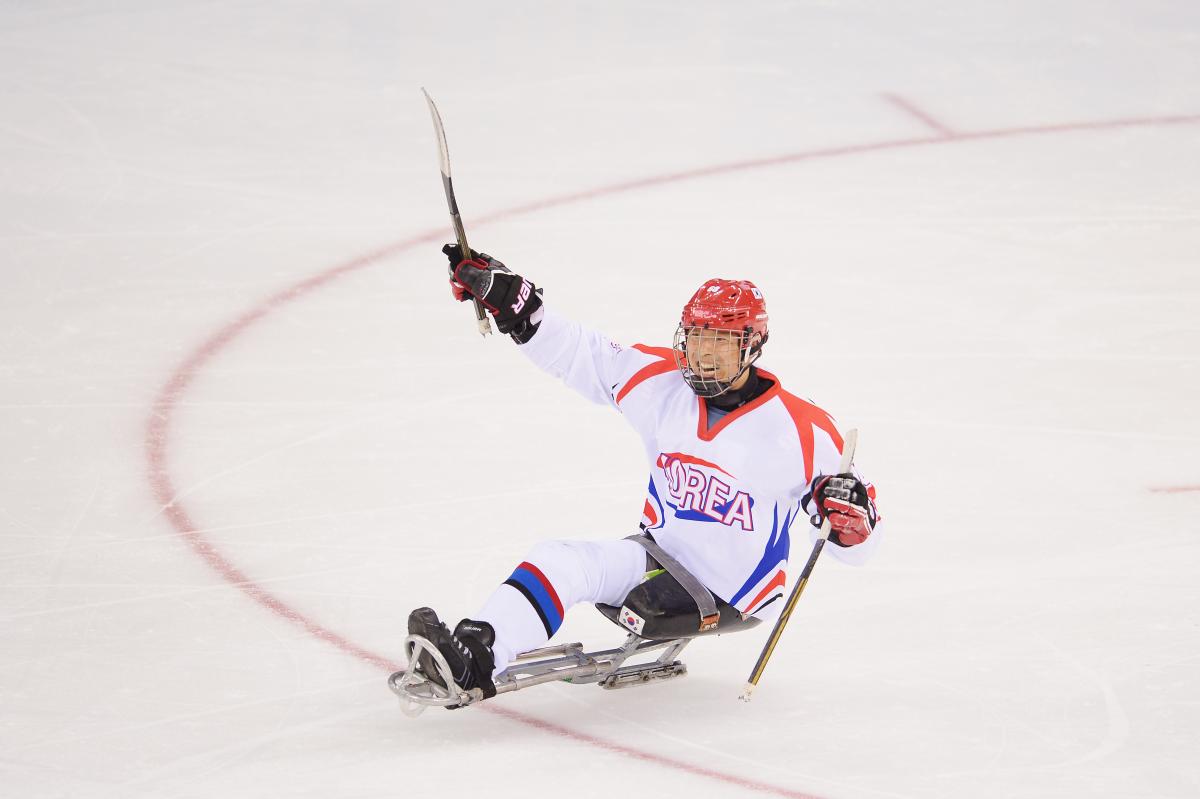 Min-Su Han celebrates after scoring the first goal for South Korea's ice sledge hockey team at Sochi 2014.