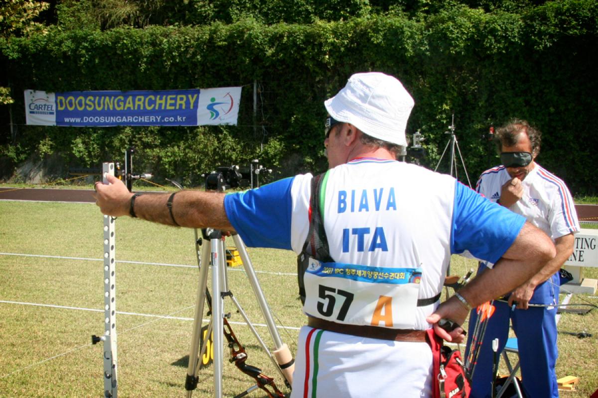 Visually impaired archers prepare for qualification at the Massa Carrara 2005 IPC World Para Archery Championships.