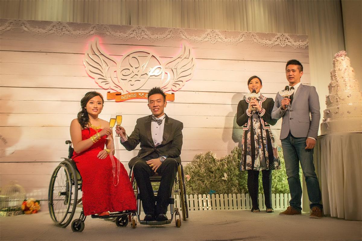 Wheelchair fencers Chan Yui Chong and Tam Chik Sum raise a toast at their wedding reception.
