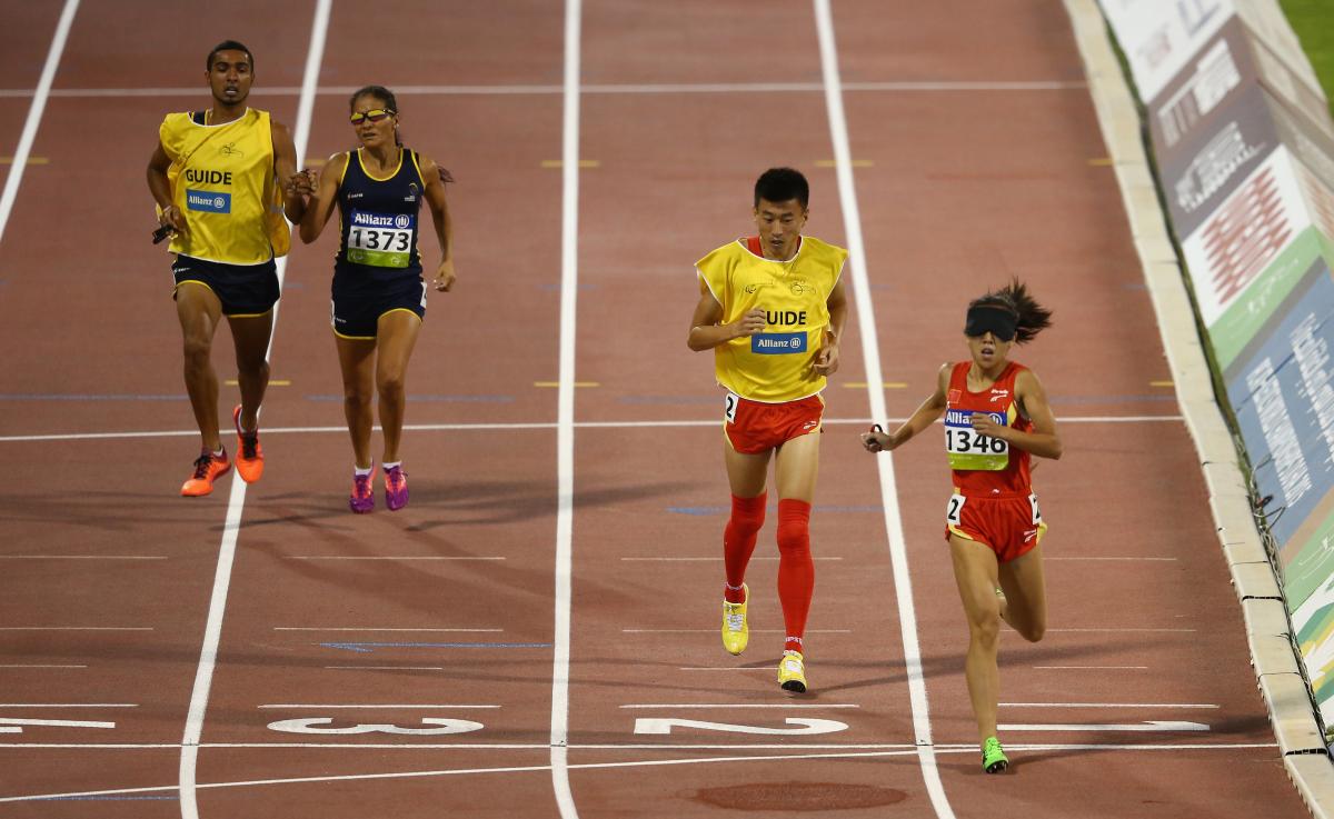 China's Jin Zheng celebrates winning the women's 1500m T11 final during the 2015 IPC Athletics World Championships.