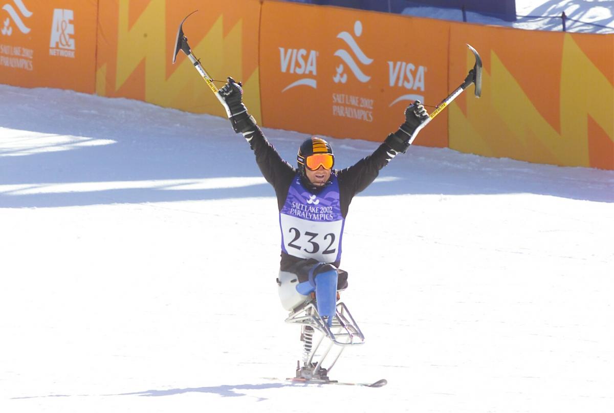 An alpine skier rejoices after finishing his race at the Salt Lake City 2002 Paralympic Winter Games.