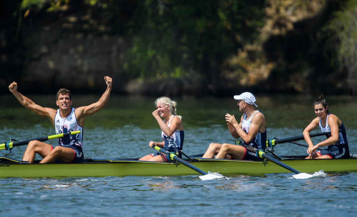 The Great Britain Gold Medal winning crew of Grace Clough GBR (bow), Daniel Brown GBR, Pamela Relph GBR, James Fox GBR and James Olicer (cox) in the LTA Mixed Coxed Four - LTAMix4+ Final A at the Lagoa Stadium.
