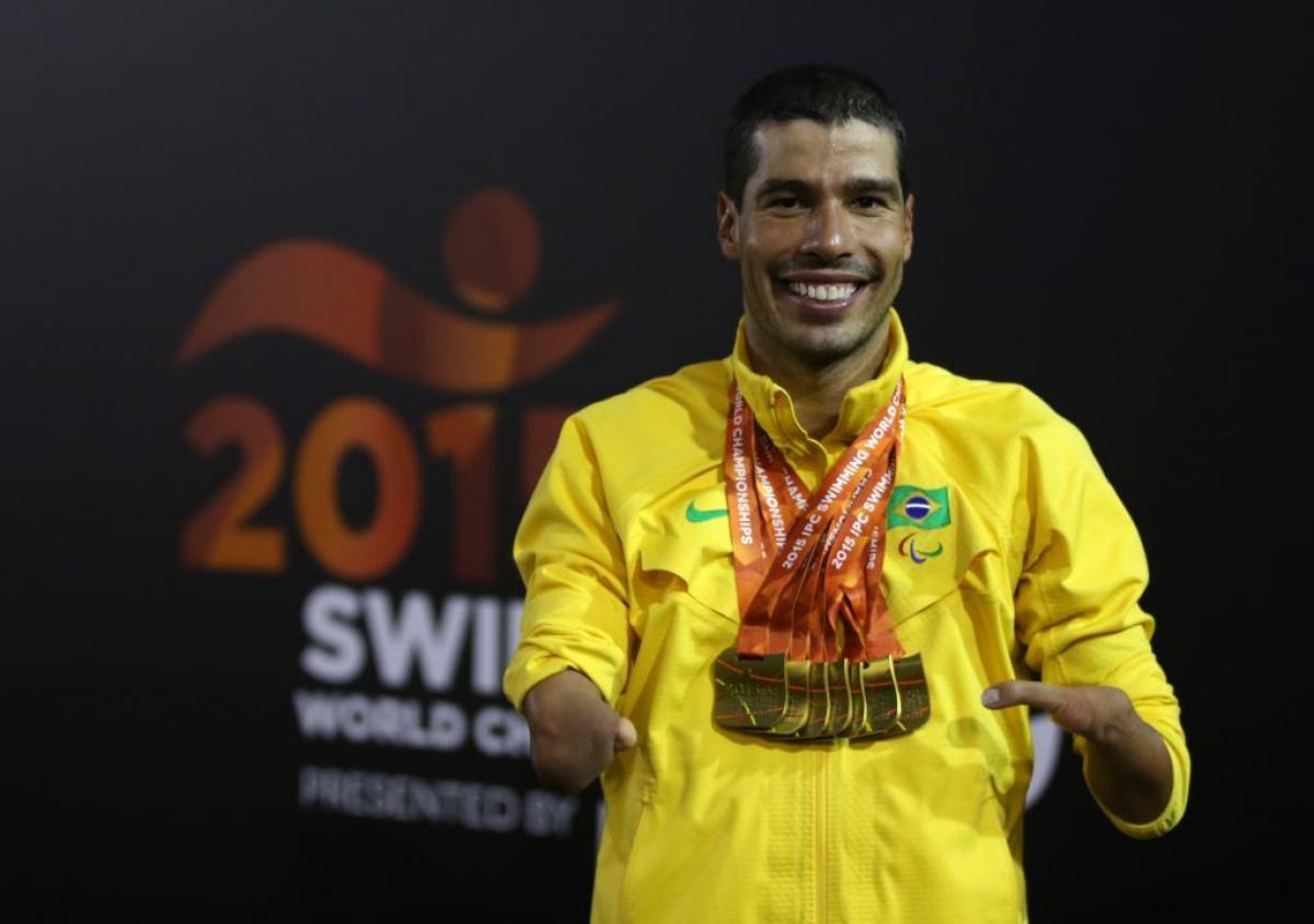 Daniel Dias of Brazil poses with his seven gold medal he won at the IPC Swimming World Championships in Glasgow, Great Britain.