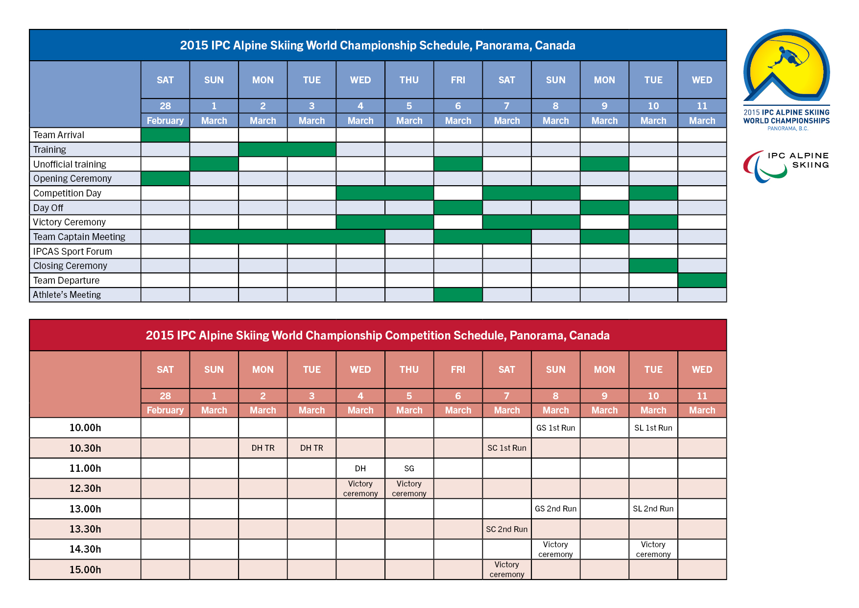 Competition schedule Please see the competition scheule on the left for current details. Related Documents Name Panorama 2015 - Competition Schedule File 150226163108014_2015_02+IPC+Alpine+Skiing+Event+Schedules_Panorama_V3_5.jpg